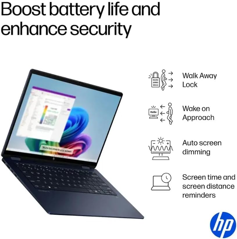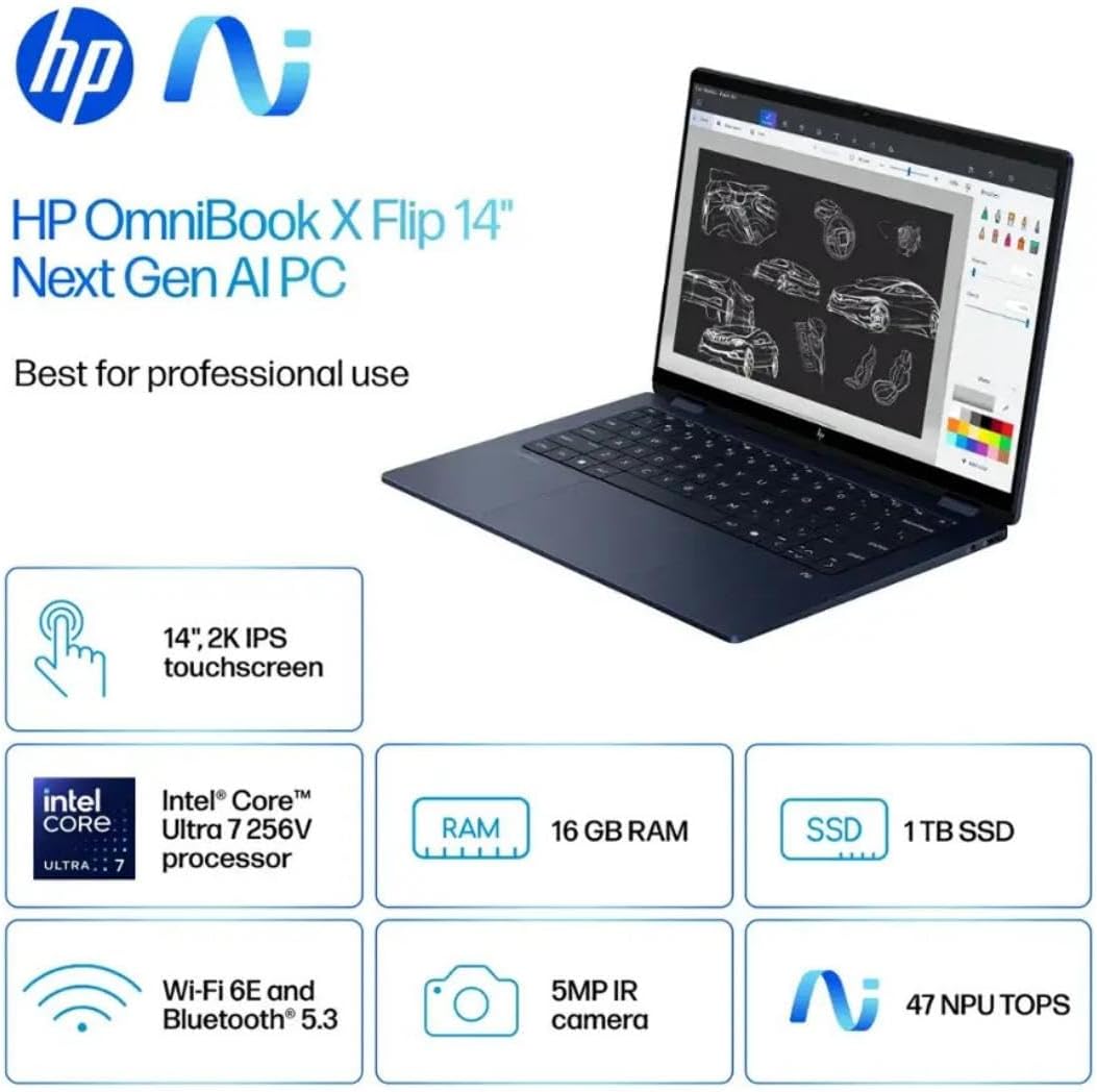 【14-Pouces 2K Écran tactile avec IPS】Grâce à une technologie intuitive, contrôlez votre PC directement depuis l'écran. Les PC HP OmniBook X Flip 14 nouvelle génération avec IA exploitent pleinement votre créativité en dessinant et en éditant grâce aux fonctionnalités Copilot+ IA existantes. Transformez votre contenu grâce à une résolution de 1920 x 1200 et un angle de vision de 178 degrés. Écran tactile multipoint, IPS (In-Plane Switching), verre bord à bord, micro-bordure et Corning Gorilla Glass 3.